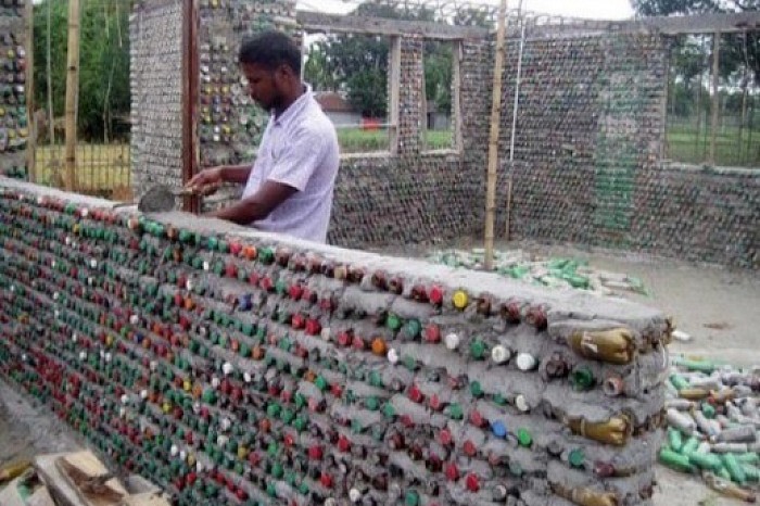 Collecting plastic waste (bags, packaging, ... ) and put them into plastic bottle to make bricks.